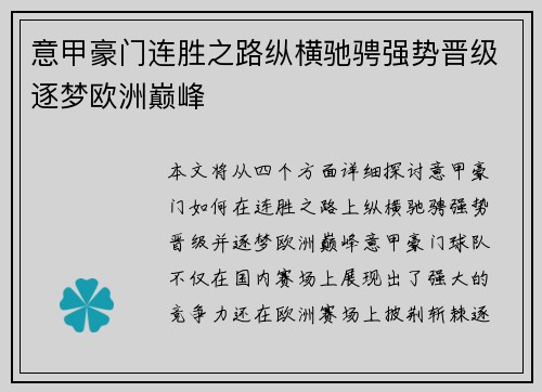 意甲豪门连胜之路纵横驰骋强势晋级逐梦欧洲巅峰